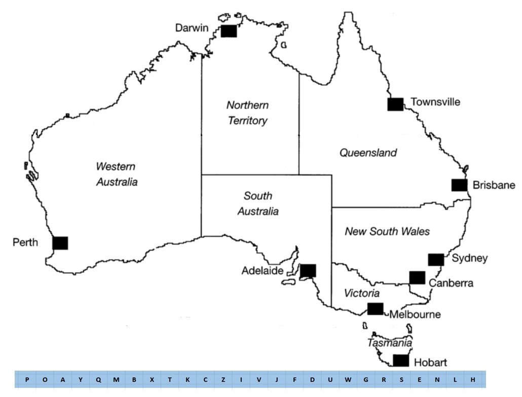 Using this map of Australian cities also shows an example of working this code backwards: take markings that already exist and make them work for your code. The trick is to jumble up your ruler to fit the data (instead of a normal alphabetical order)