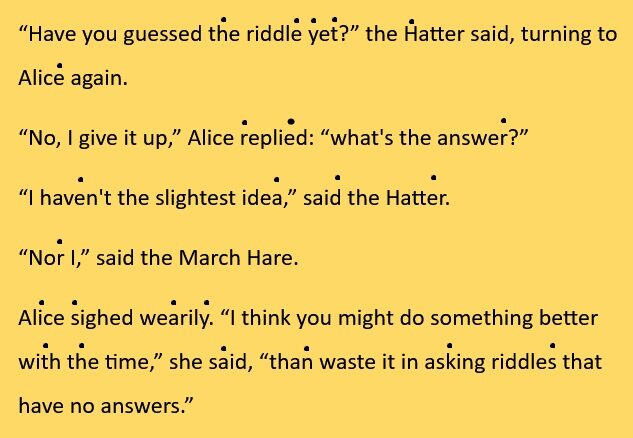 While today you’ve been confronted with quotes from the Alice books, it does pay off to create your own mundane text to fit in your desired message in a carefully chosen block to read in a shorter timeframe (rather than the above where we grabbed a quote and worked backwards to hide a message within it).